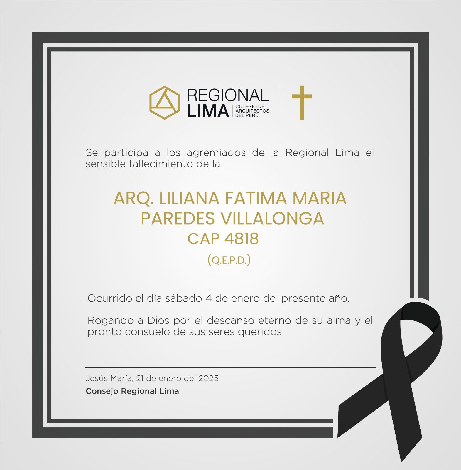 Defunción: Arq. Liliana Fátima María Paredes Villalonga CAP 4818 | NotiCAPLima 019 – 2025