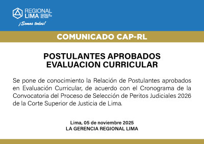Se pone de conocimiento la Relación de Postulantes aprobados en Examen de Conocimientos, en concordancia con el Cronograma de actividades de la Convocatoria del Proceso de Selección de Peritos Judiciales 2026 de la Corte Superior de Justicia de Lima.